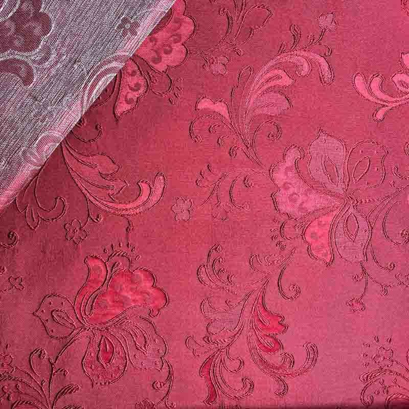 Brocado bordeaux com padrão de flores e cachemir. Este tecido caracteriza-se pelo seu brilho e grande resistência.