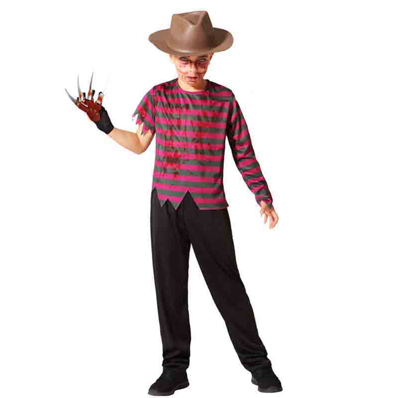 Fato Assassino de Riscas de Criança (Freddy Krueger ). Inclui: T-shirt de Riscas suja de sangue e Calças. O restante não está incluído