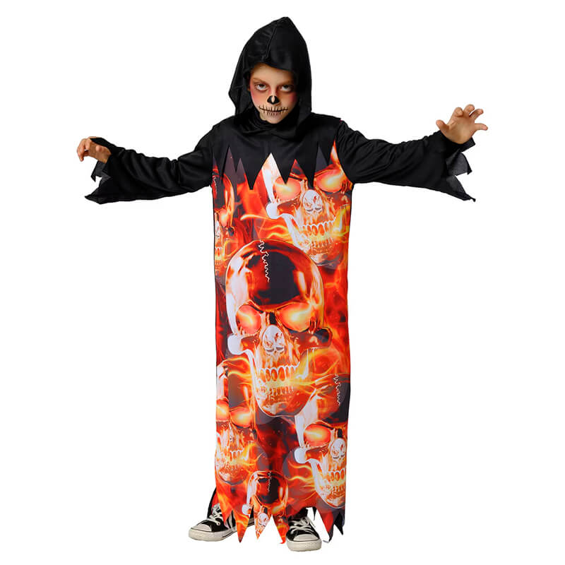 Fato Caveiras Inferno. Inclui: Túnica com capuz e Meias. O restante não está incluído.