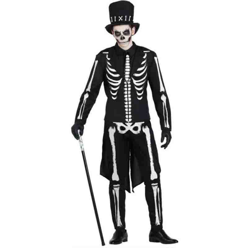 Fato Esqueleto Dandy de Adulto. Inclui: Jaqueta com Colarinho e Gravata. Calças e Chapéu. O restante não está incluído