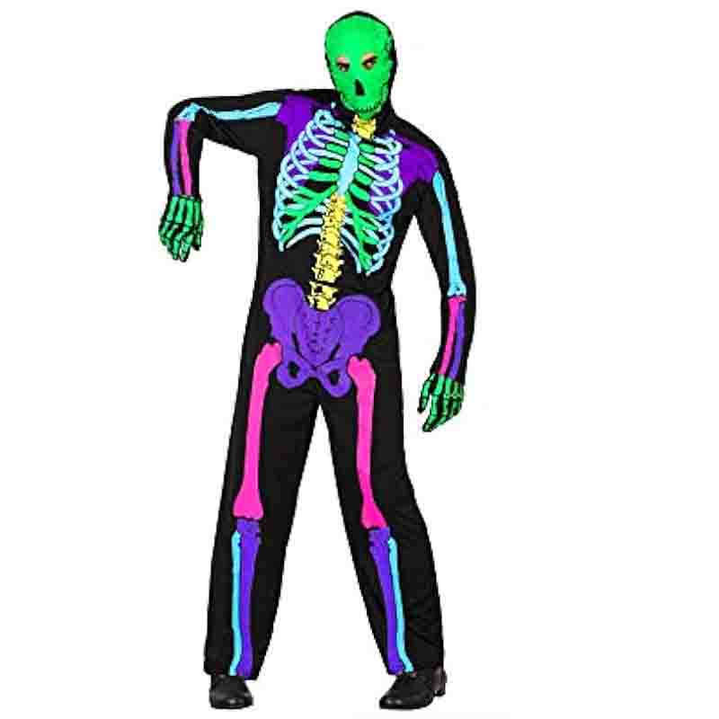 Fato Esqueleto Multicolor de Adulto. Inclui: Macacão. Capuz e Luvas. O restante não está incluído.