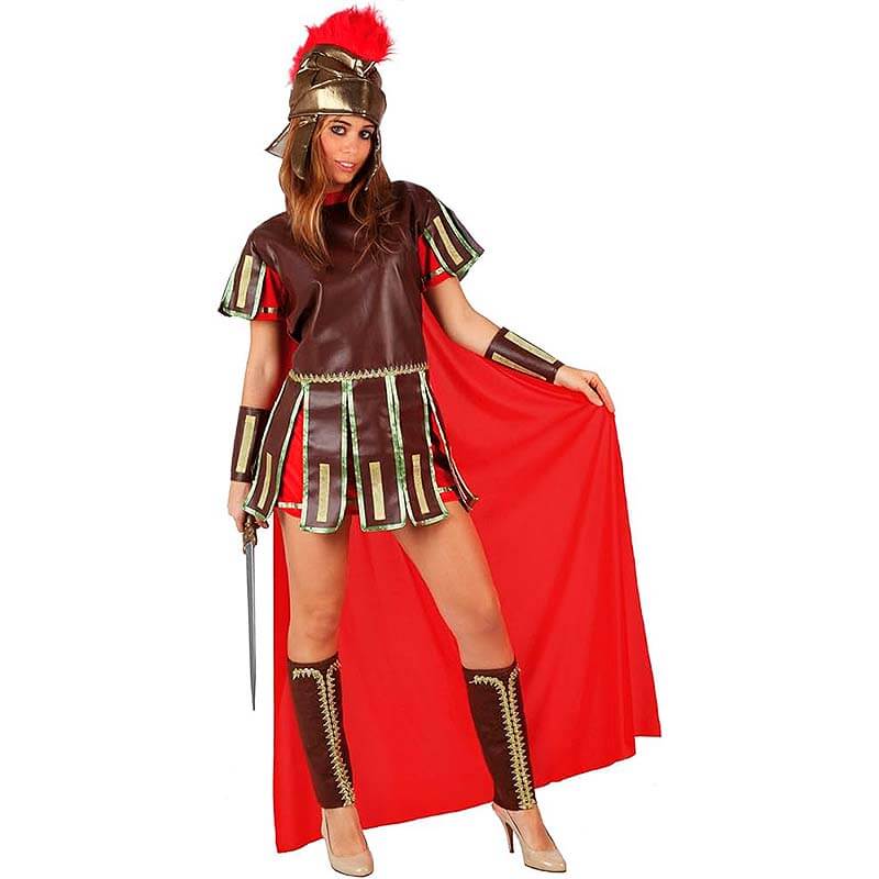 Fato Guerreira Romana de Adulto. Inclui: Vestido com Capa. Perneiras. Braceletes e Chapéu. O restante não está incluído.