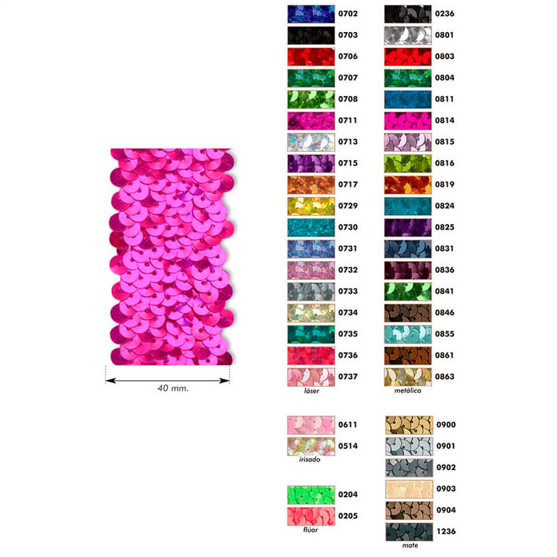 Fita Lantejoula Elástica 4 cm em várias cores. O preço é por metro. Disponível em praticamente todas as cores que aparecem na fotografia.