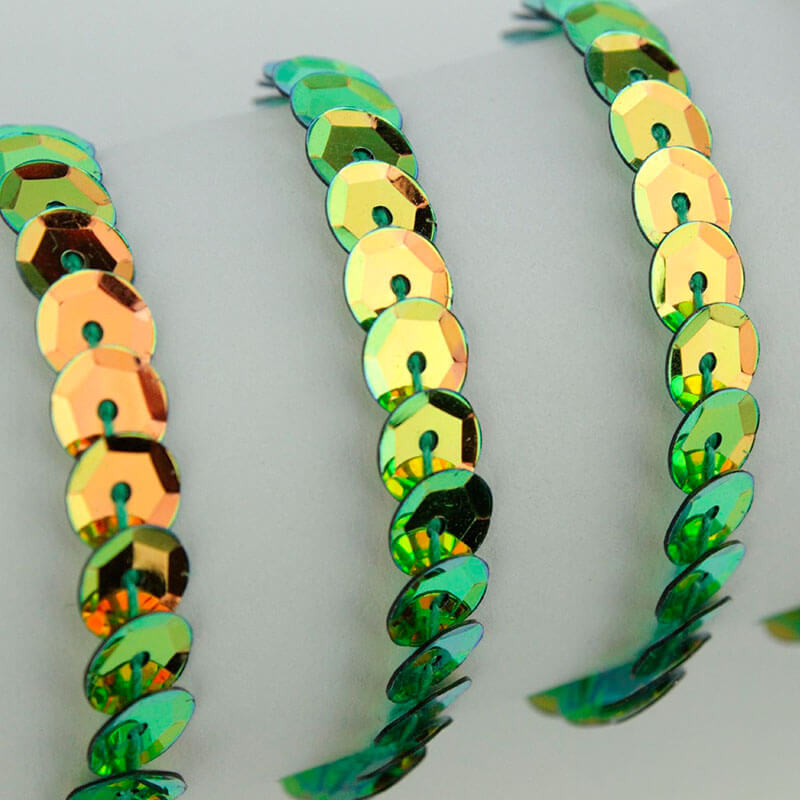 Fita de lantejoula especial em verde escuro de brilho irisado. O preço é por metro.