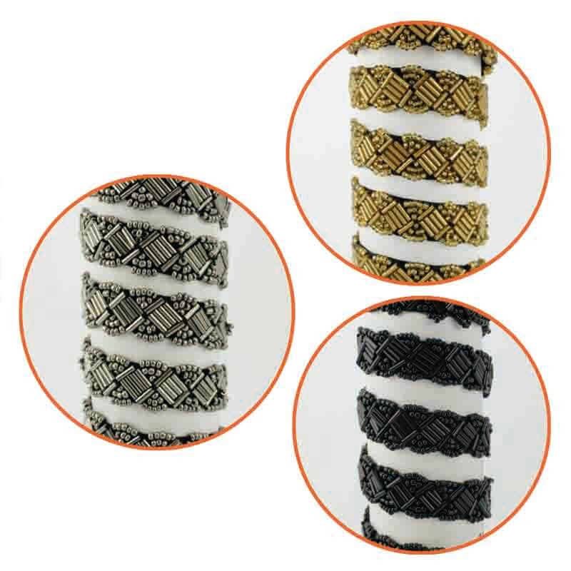 Galão em fita com enfeites de miçangas em tecido preto. Um material ideal para finalizar suas roupas. Vai dar um toque de textura e outro toque de brilho. A conta e as bolinhas são presas com linha em uma fita de tecido preto, o que lhe dá corpo e o torna um material de fácil aplicação.