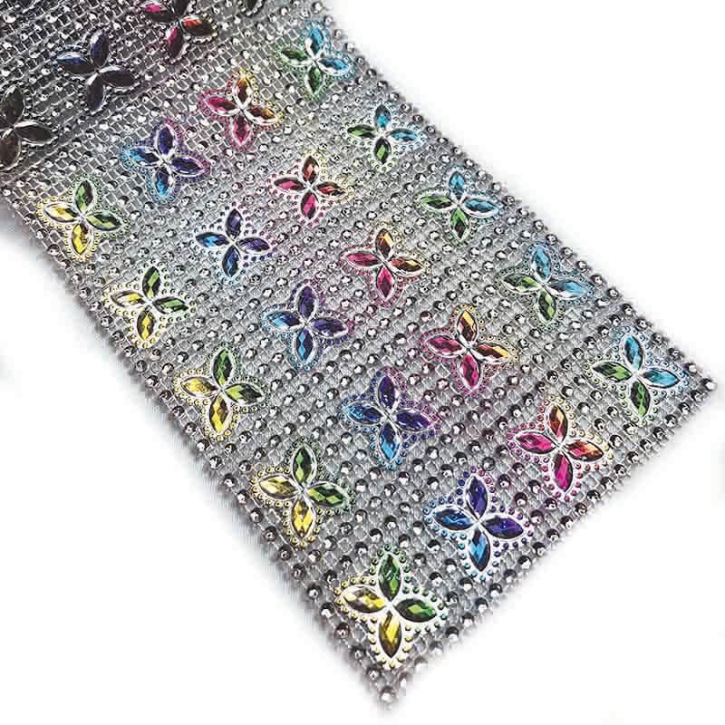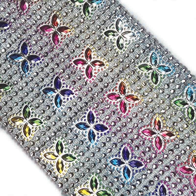 Galão plástico com enfeites metálicos de strass de 24 linhas com imitações de pedras e trevos coloridos. Ele irá adicionar brilho dinâmico e uma textura semelhante a uma joia ao figurino.