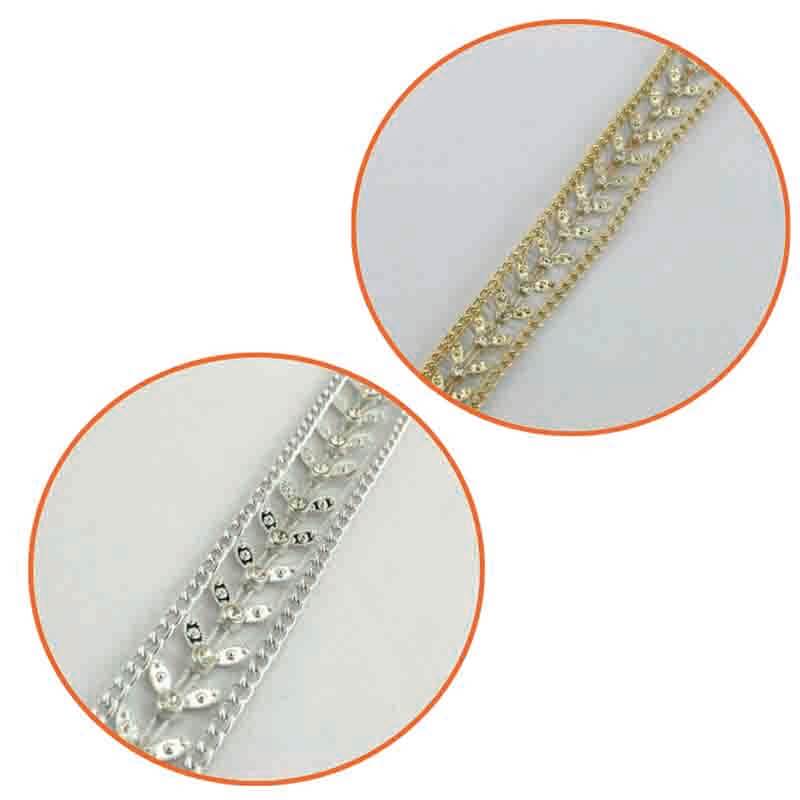 Galão Termocolante em flechas com uma fileira de correntes e flores de strass. Este enfeite de fita metálica é um material perfeito para dar brilho às roupas com as pequenas aplicações de strass na fita. Além disso, as duas fileiras de correntes conferem muito corpo e uma textura metálica ao toque.