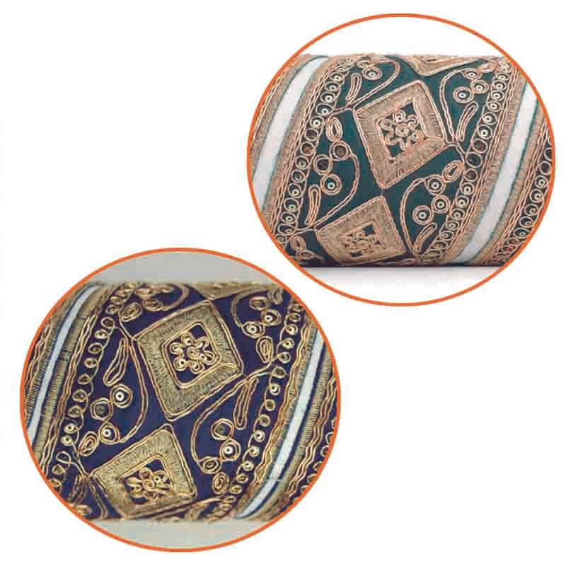 Galão largo com bordados metálicos em tecido lamê. Um material de qualidade e de grande beleza. É ideal para finalizar vestidos de carnaval, decoração de interiores ou como complemento de marroquinaria.