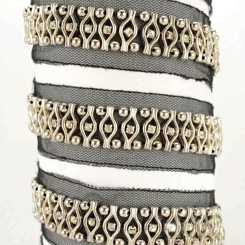 Galão com bolas de metal e pedra brilhante. Um material ideal como complemento de couro. Combina muito bem com cores escuras, vem com fundo em tule de poliéster. A corrente central possui strass aplicados.