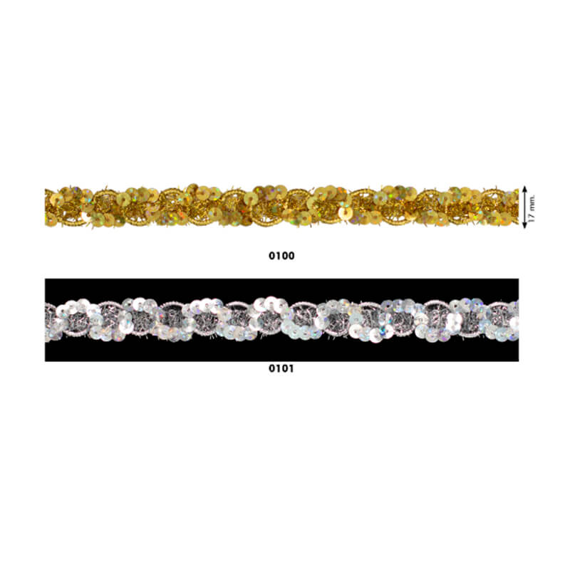 Galão entrançado com bordados de ondas cruzadas, uma feita de lantejoulas e outra de lurex, ambas presas por um fio de nylon muito fino que lhe serve de núcleo. Um artigo com inúmeras opções para fazer fatos, fantasias e adereços para o Carnaval.