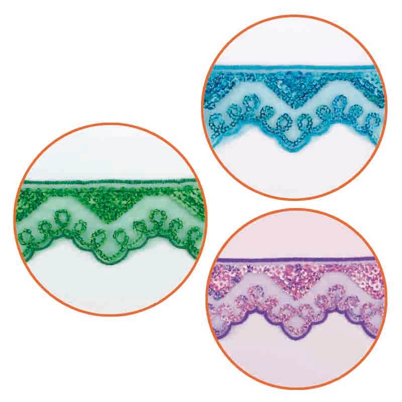 Galão em chiffon bordado com lantejoulas em desenho padrão com acabamento tipo guirlanda. Graças ao suporte de gaze, é um material fácil de usar, tanto com máquina como com adesivos. Vai dar cor, desenho e um pouco de brilho.