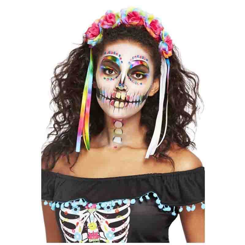 Kit Maquilhagem Dia dos Mortos. Inclui : Bandolete. Pestanas. Sobrancelhas. Brilhantes. Tintas de água 2 x 5 gr e 1 x 5 gr. Pincel e Esponja