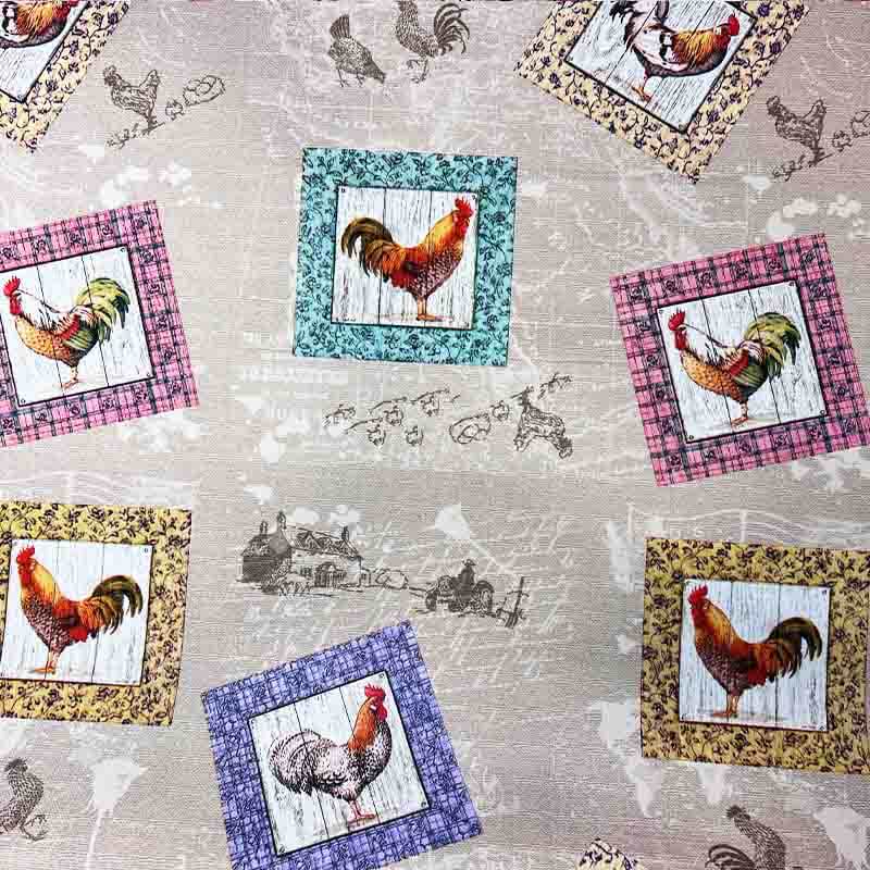 Tecido com galos em fundo bege. Rápida secagem e anti-nódoas. Ideal para toalha de mesa.