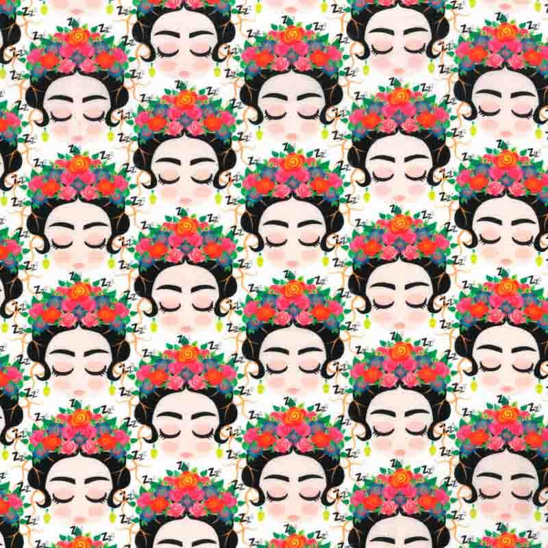 Tecido 100% algodão estampado com caras de Fridas a dormir em fundo branco.